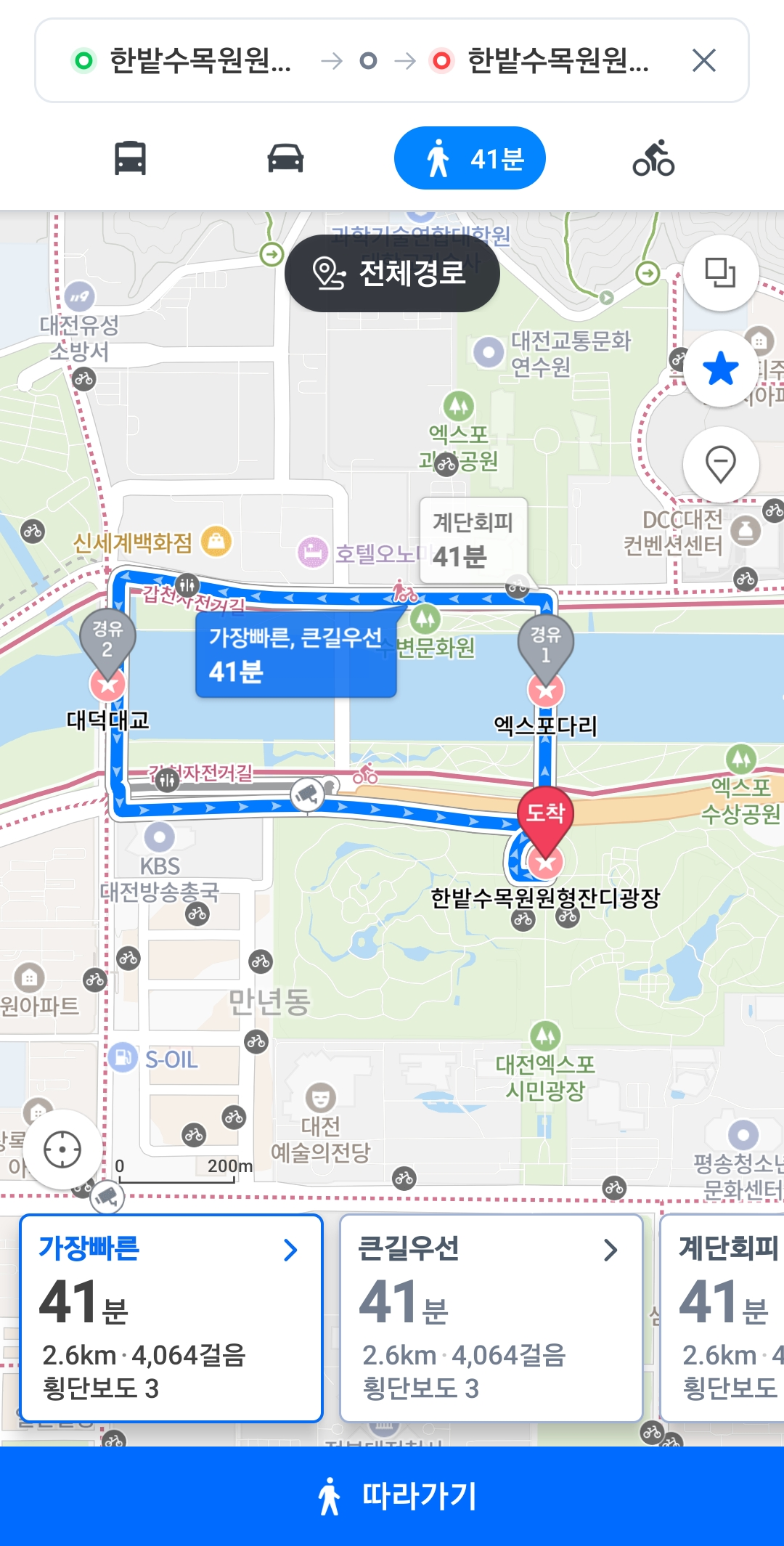 - 하단에 뜨는 경로 종류, 소요 시간, 거리, 걸음수, 횡단보도 개수 등을 확인하고 맘에 드는 경로를 선택한다.