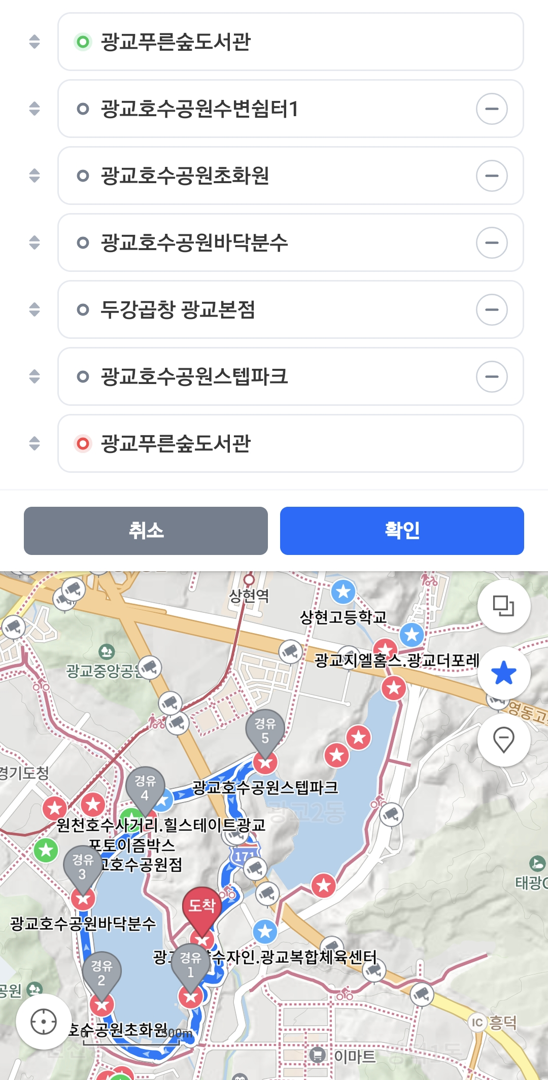 네이버 지도에서 광교호수공원 고래런 경로 설정해보려다가 경유지 최대 개수가 6개인 것을 알았다.